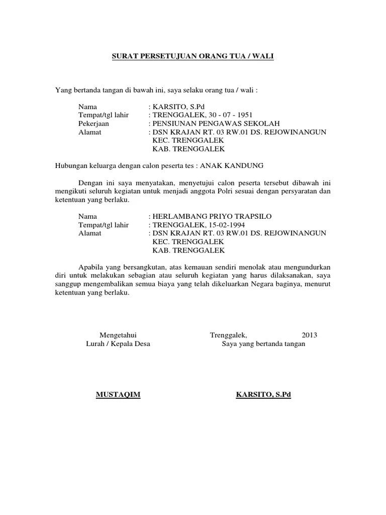 Sangat cocok untuk kamu jadikan referensi ! Yang bertandatangan di bawah ini, saya: Tanggal penulisan, · perihal surat, · nama orang tua, · alamat orang tua, · telepon orang tua (opsional), · nama anak, · nama kegiatan, · tanggal . Dengan ini mengizinkan / tidak mengizinkan anak saya untuk mengikuti kegiatan. Pentinganya surat izin orang tua untuk melamar pekerjaan ini, anda bisa gunakan contoh dibawah ini sebagai persyaratan melamar pekerjaan di salah satu .